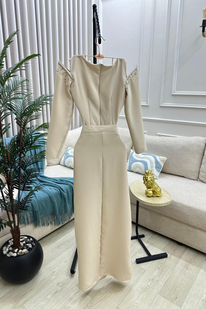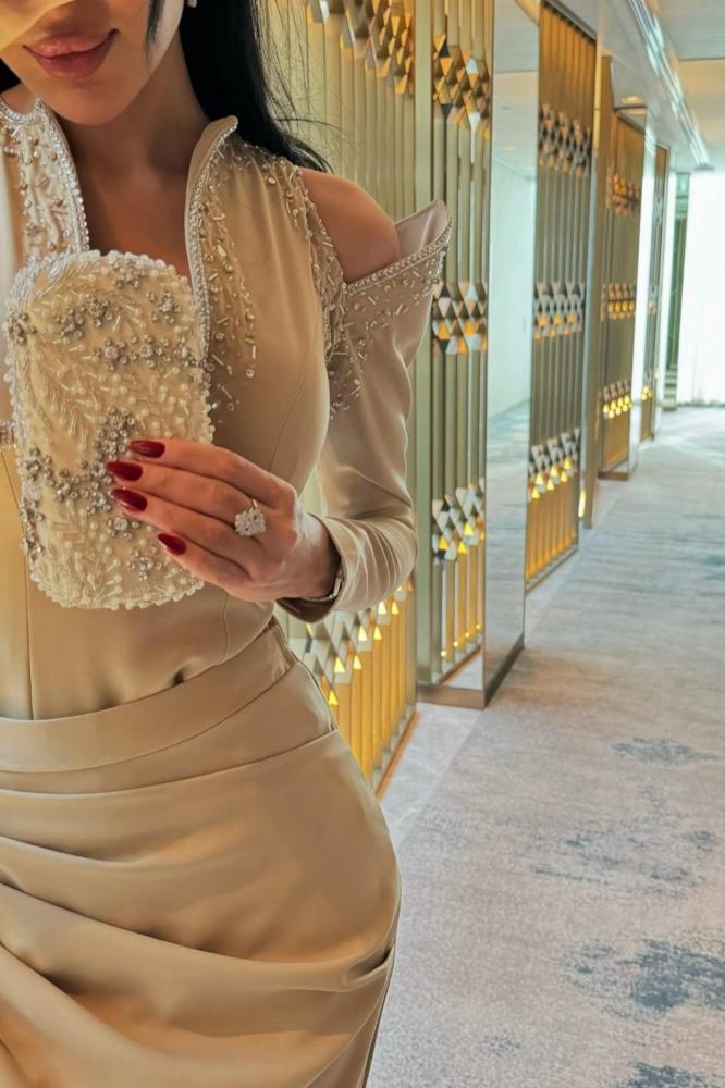 تألقي بإطلالة ناعمة وفخمة بهذا الفستان البيج الساحر، بتصميم أكمام طويلة شفافة مزينة يدويًا بالخرز واللؤلؤ، يضفي لمسة رومانسية راقية على إطلالتك. مثالي للمناسبات الكلاسيكية، الخطوبة، أو حفلات المساء.