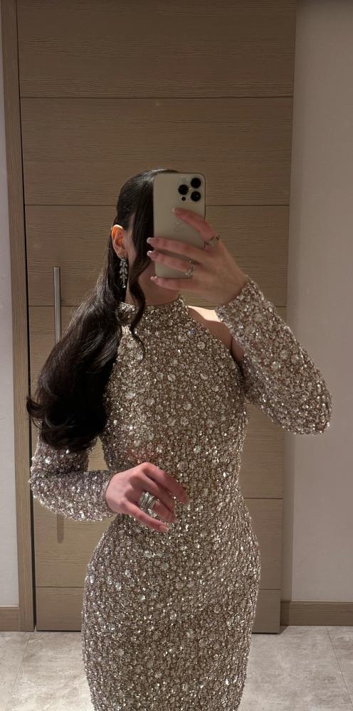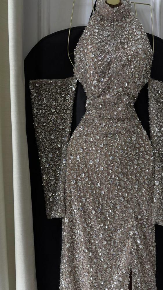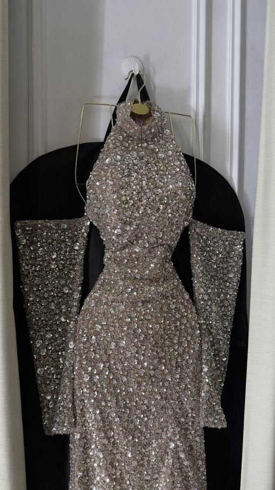 استمتعي بإطلالة لافتة مع هذا الفستان البيج الأنيق، المصمم بتفاصيل رقيقة تعكس الرقي والفخامة. يزدان بتطريز زركون لامع يمنحك بريقًا ساحرًا تحت الأضواء، ليكون خيارك الأمثل في الحفلات والسهرات المميزة.