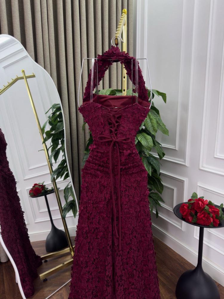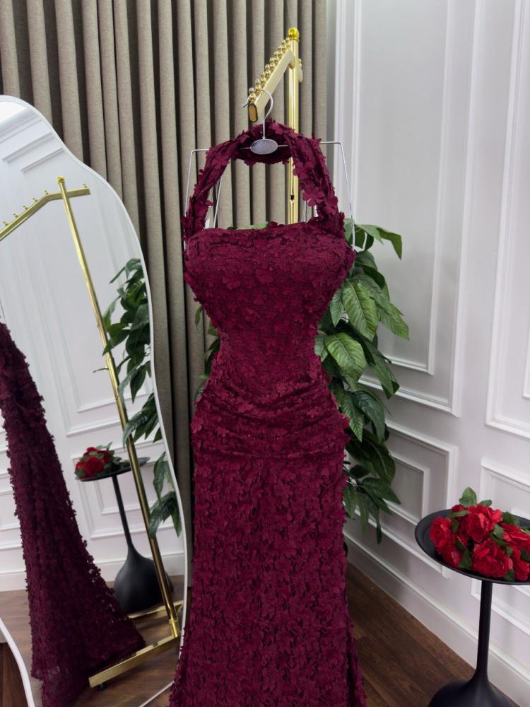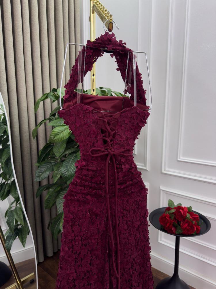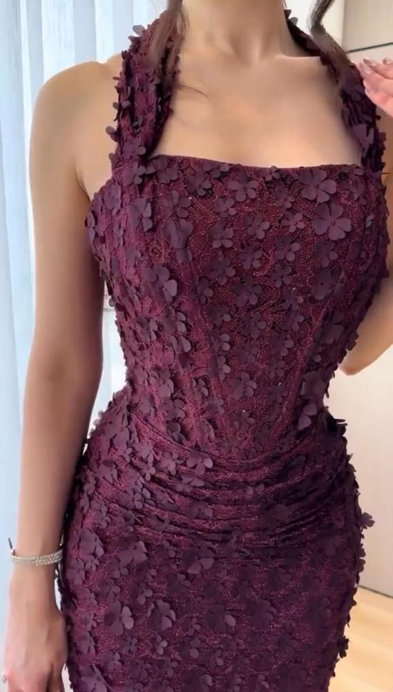 فستان سهرة دانتيل مورد باللون العودي مع تصميم راقٍ عند الرقبة 0202