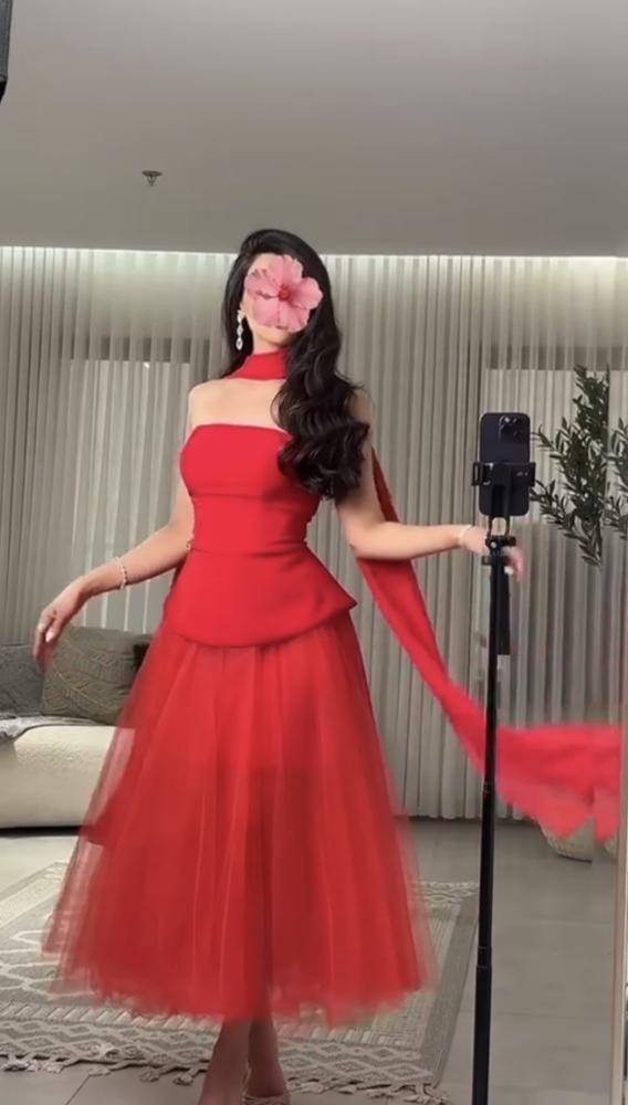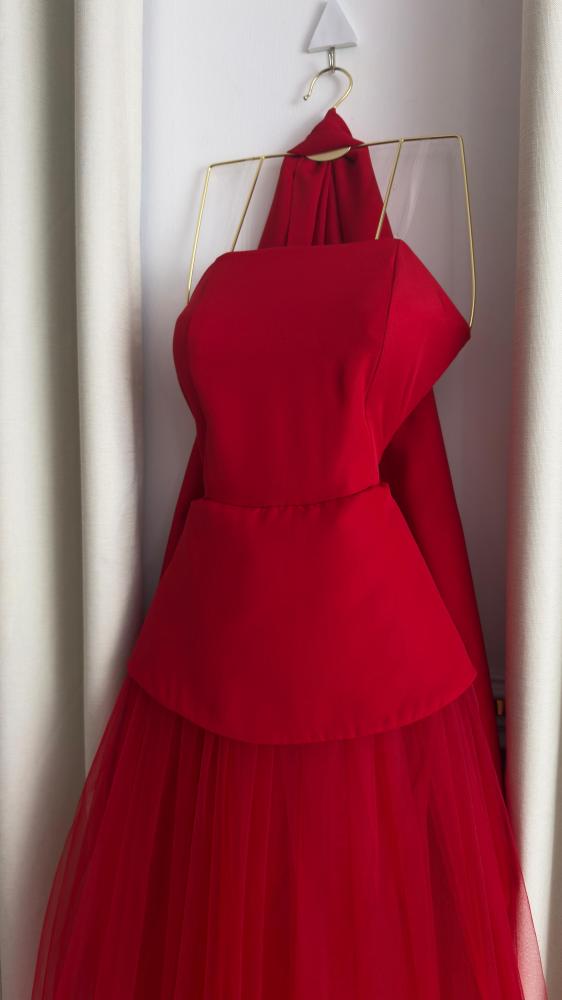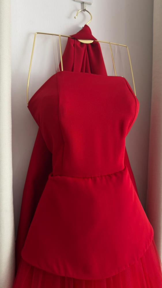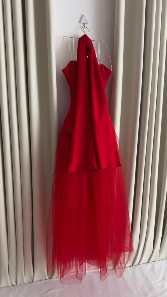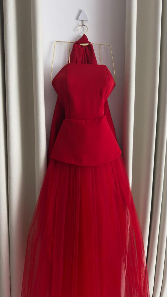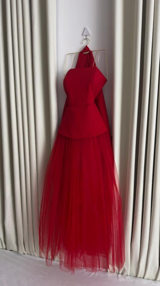إطلالة راقية تليق بمناسباتك مع هذا الفستان المصمم من خامة التل الناعمة والباربي الفخم، ليجمع بين البساطة والفخامة في آن واحد.