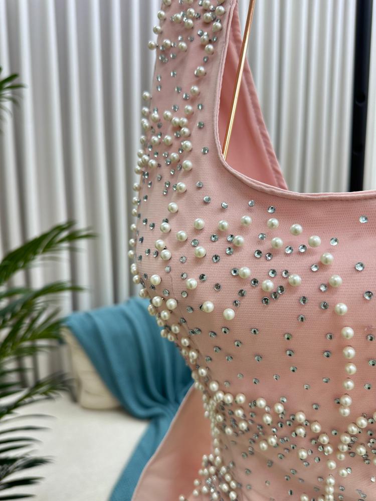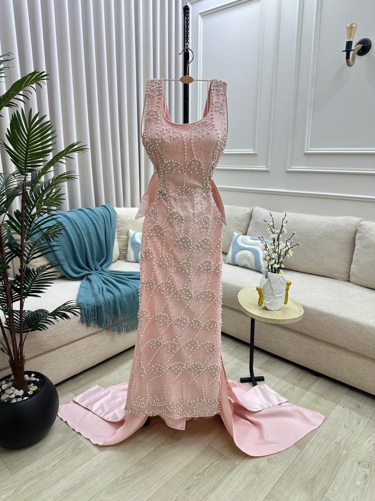 فستان بلون وردي ناعم ينبض أنوثة وفخامة، مصمّم بعناية ليناسب ذوقك الراقي.