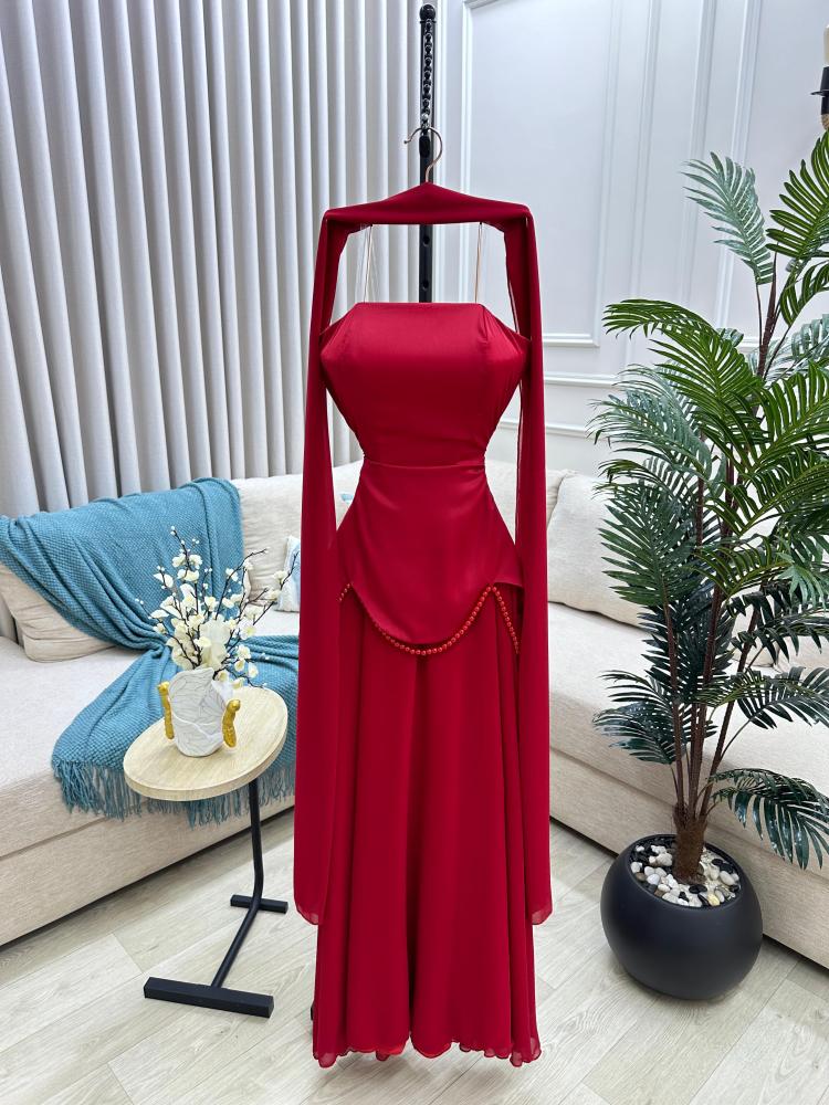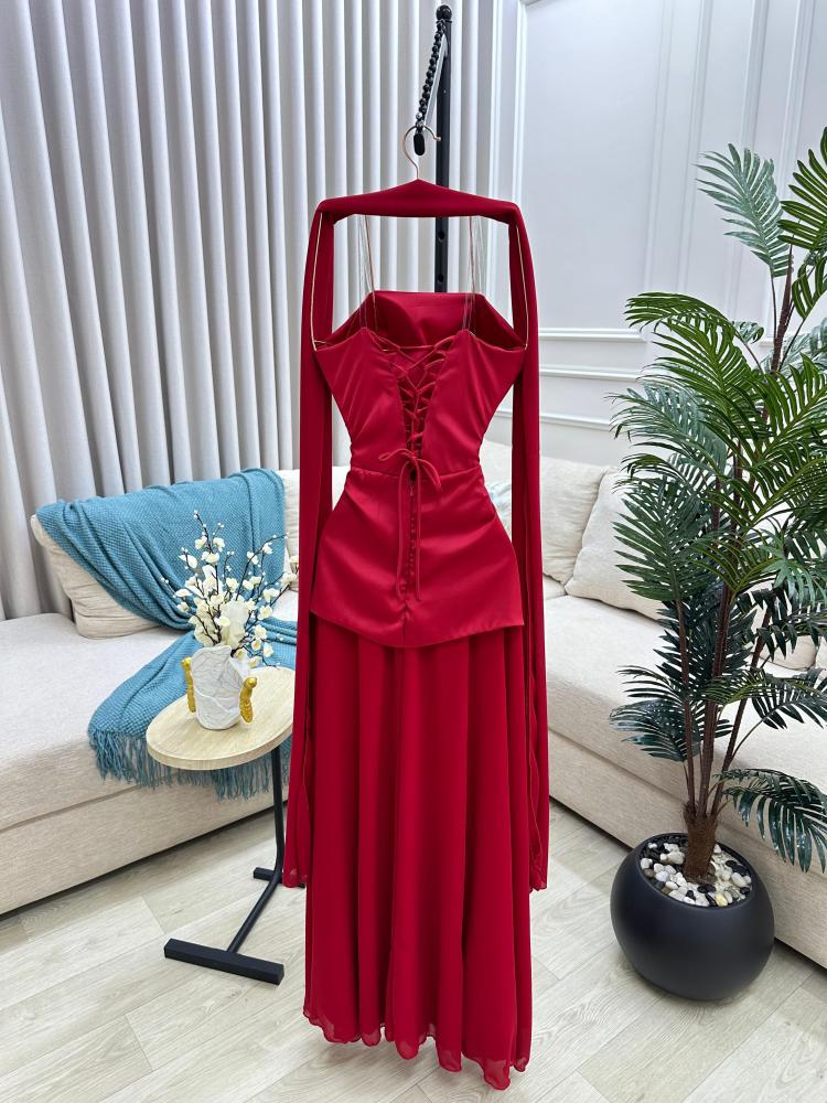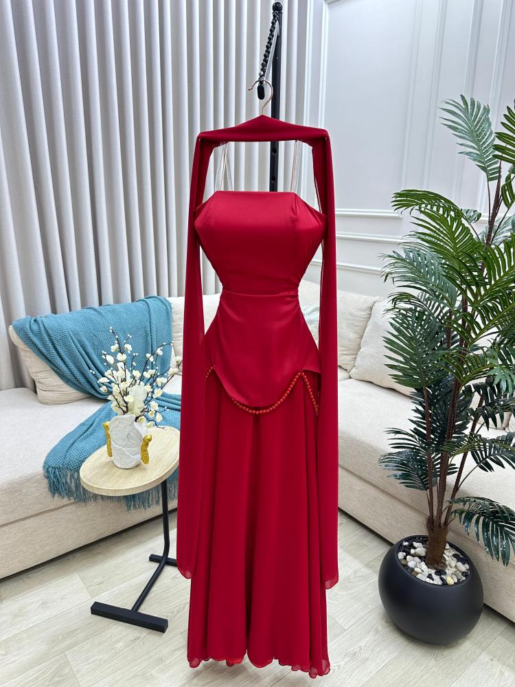 فستان سهرة فاخر باللون الأحمر الجريء، بتصميم راقٍ يبرز أنوثتك بإطلالة لا تُنسى.