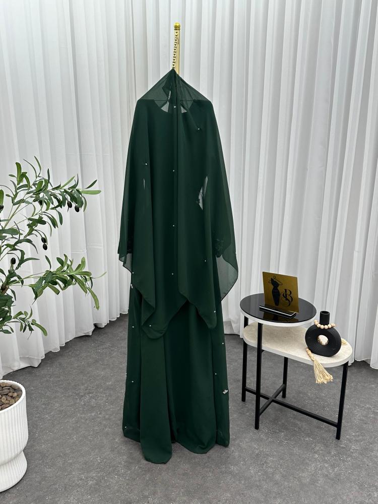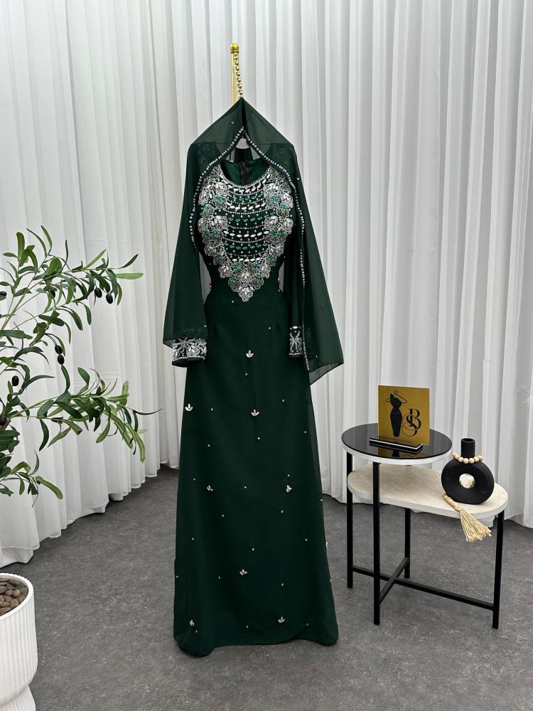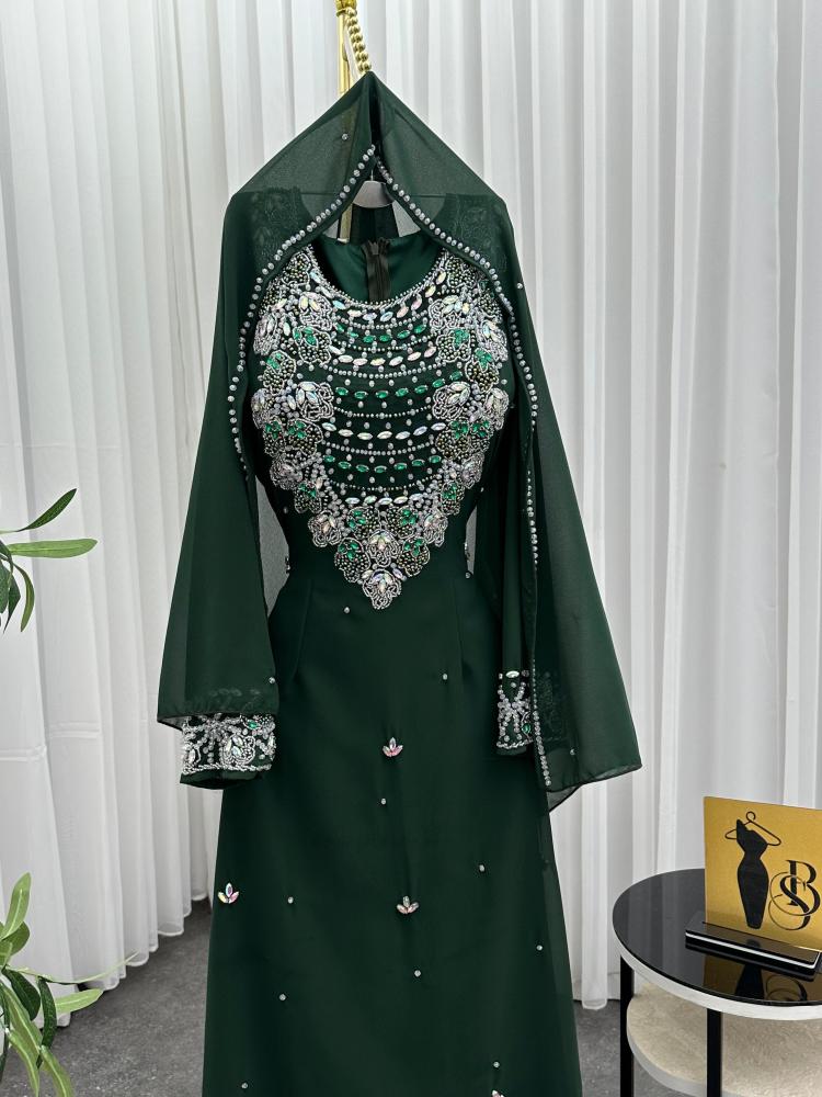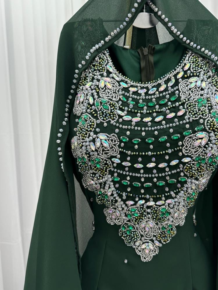 مخور سهرة أنيق بخامة شيفون جورجيت ناعم وراقي، مزين بتطريز فاخر على الصدر والأكمام، ومطعم بفصوص الزركون الأصلي اللي تعكس الضوء ببريق ساحر.