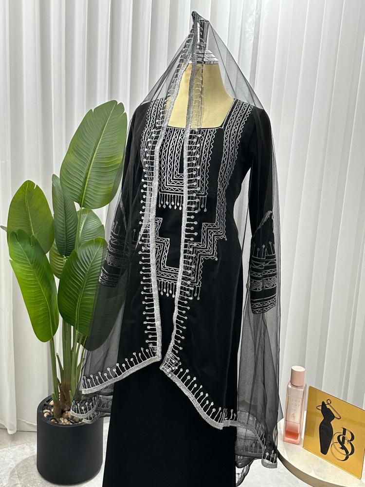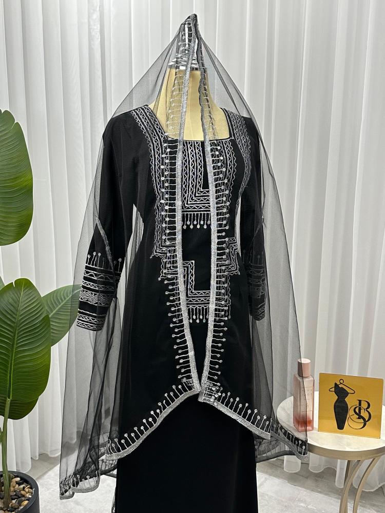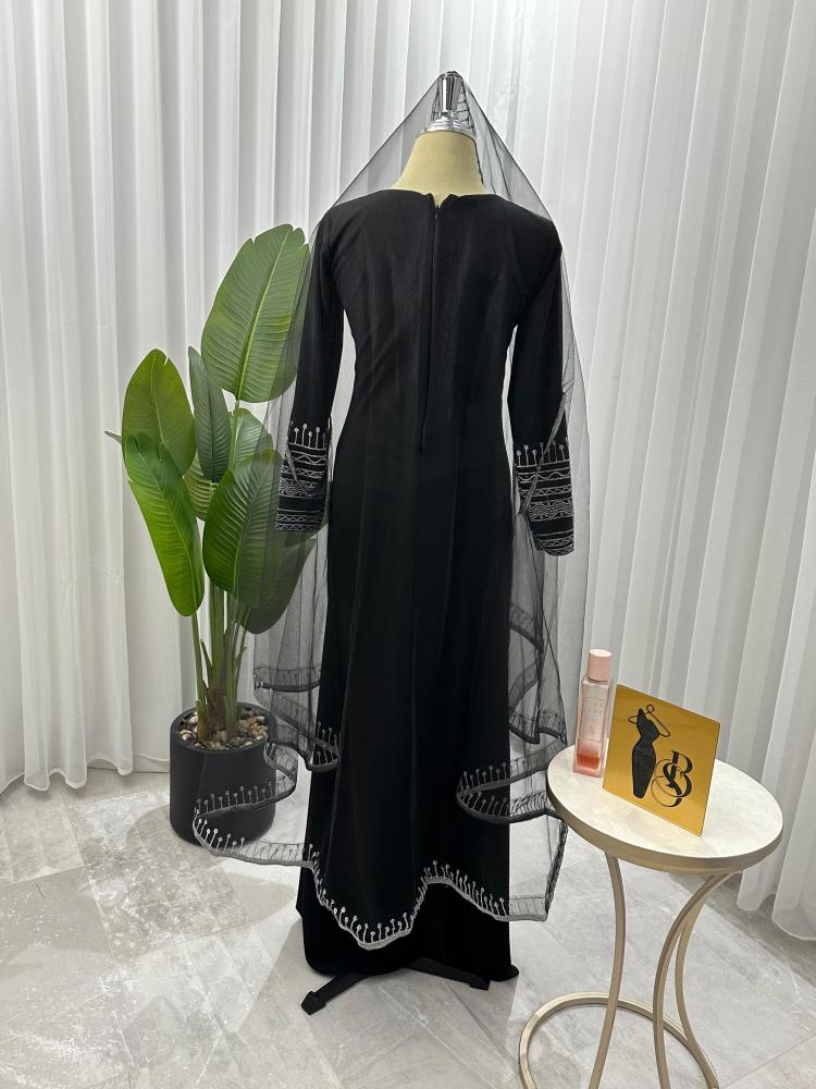تميّزي بإطلالة مستوحاة من التراث العريق مع هذه الجلابية العسيرية الفاخرة، المصنوعة من خامة كريب ناعمة ومرفقة بطرحة بنفس التصميم لتكمل أناقتك بأسلوب ملكي.