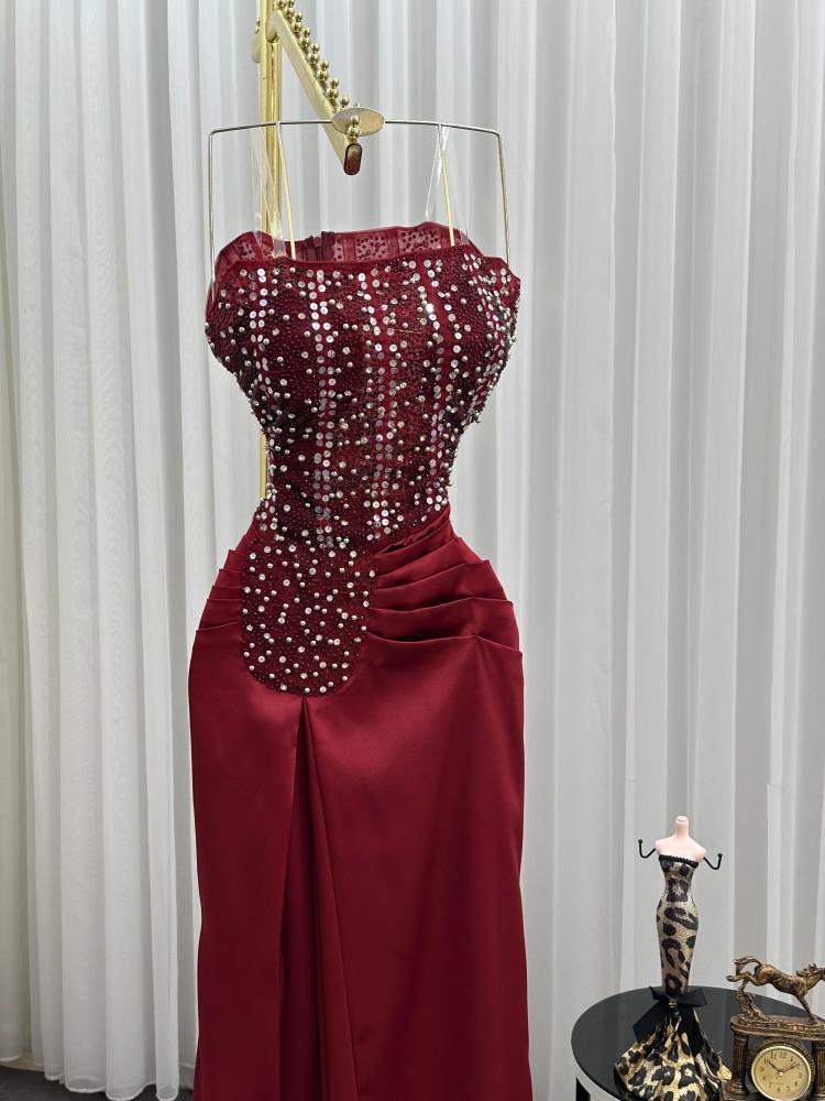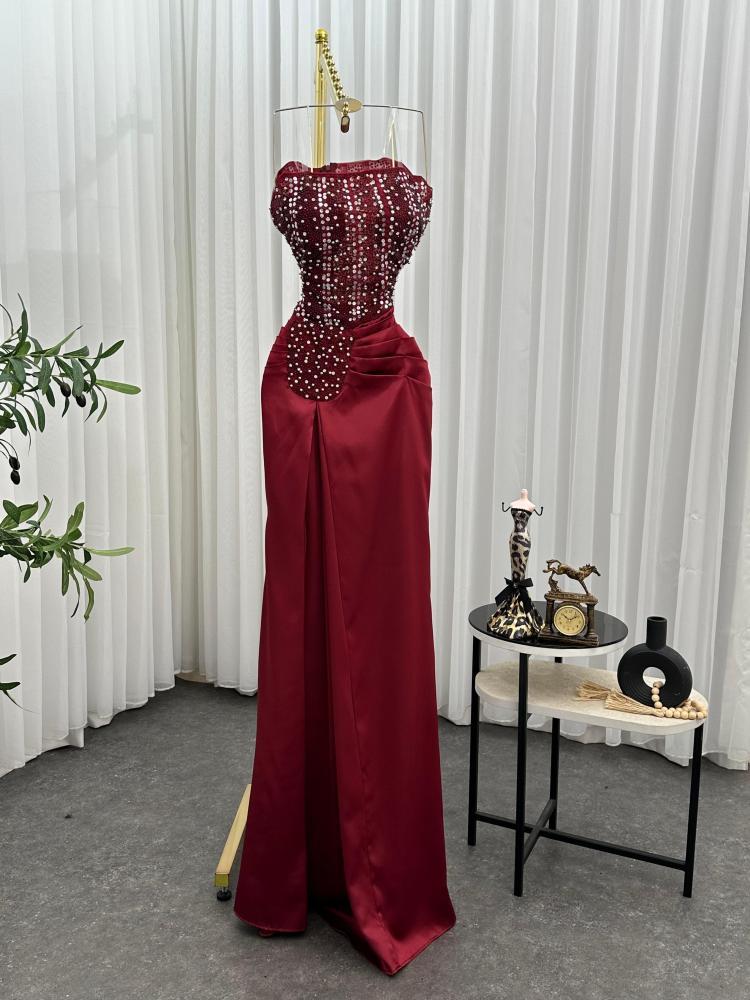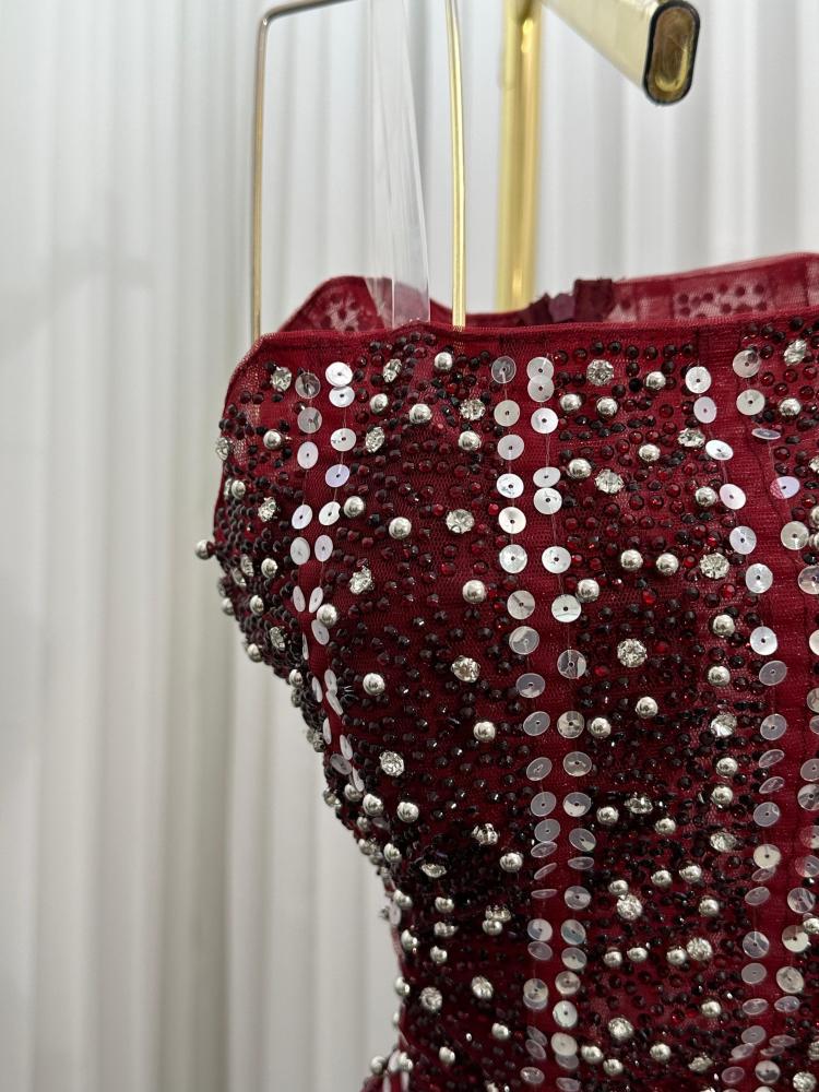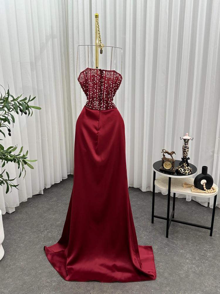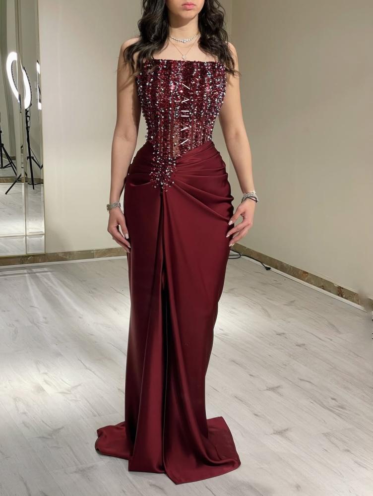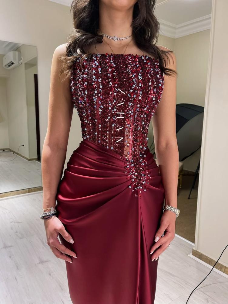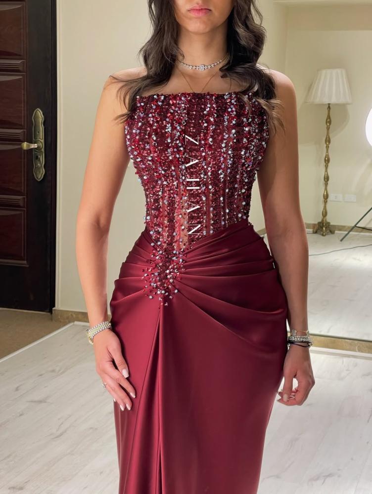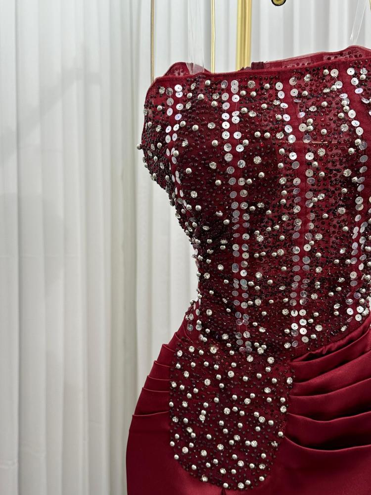 استمتعي بأناقة ساحرة مع هذا الفستان العودي المميز، بتصميم توب فاخر يبرز جمال القوام وتطريز لؤلؤي يدوي متقن على منطقة الصدر.