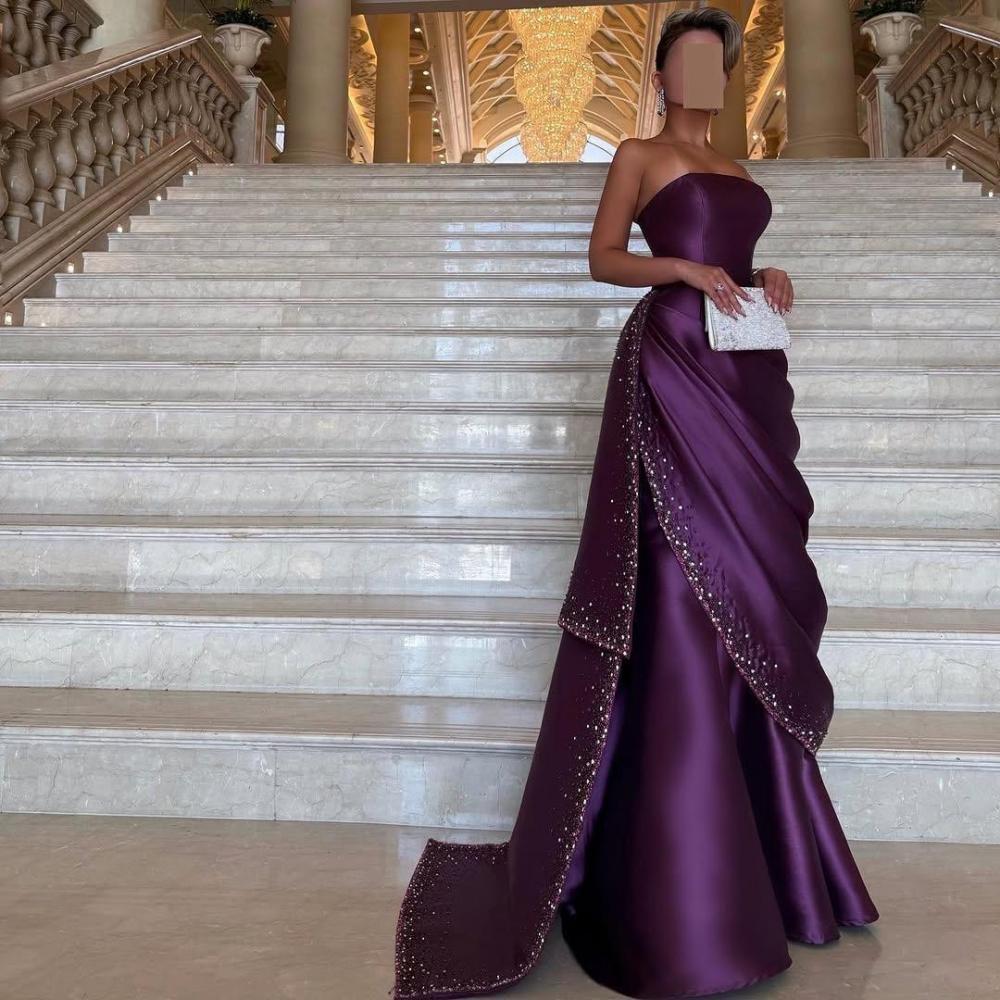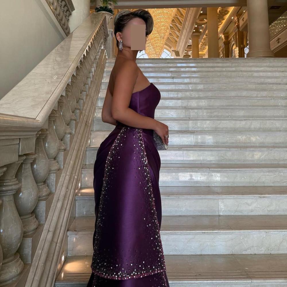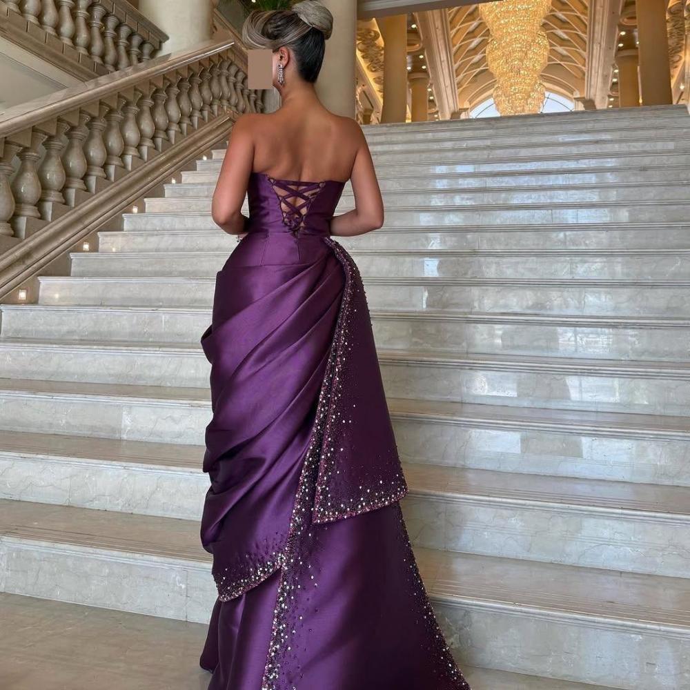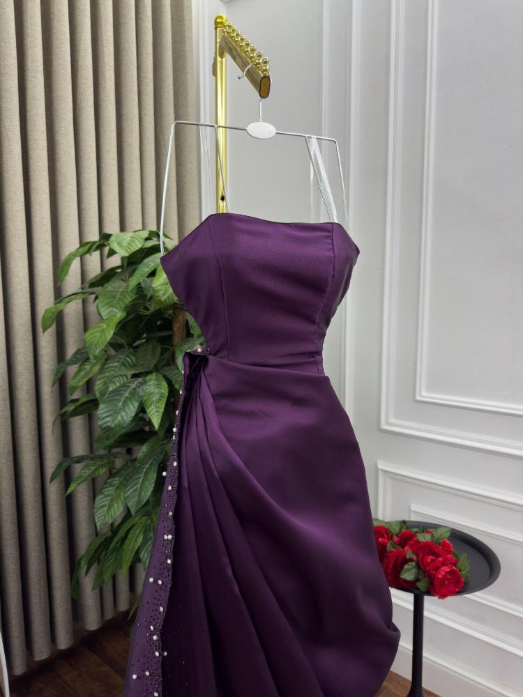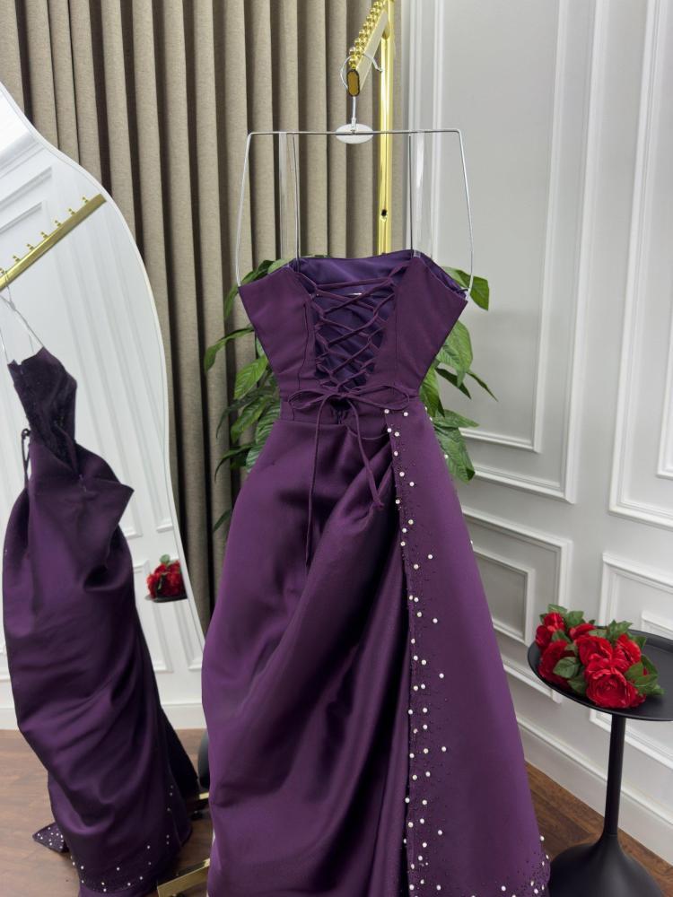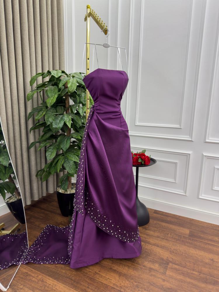تميّزي بإطلالة ملكية مع هذا الفستان الفاخر بلونه الموف الغامق وتصميمه الراقي المزيّن بفصوص لامعة على الجانب.