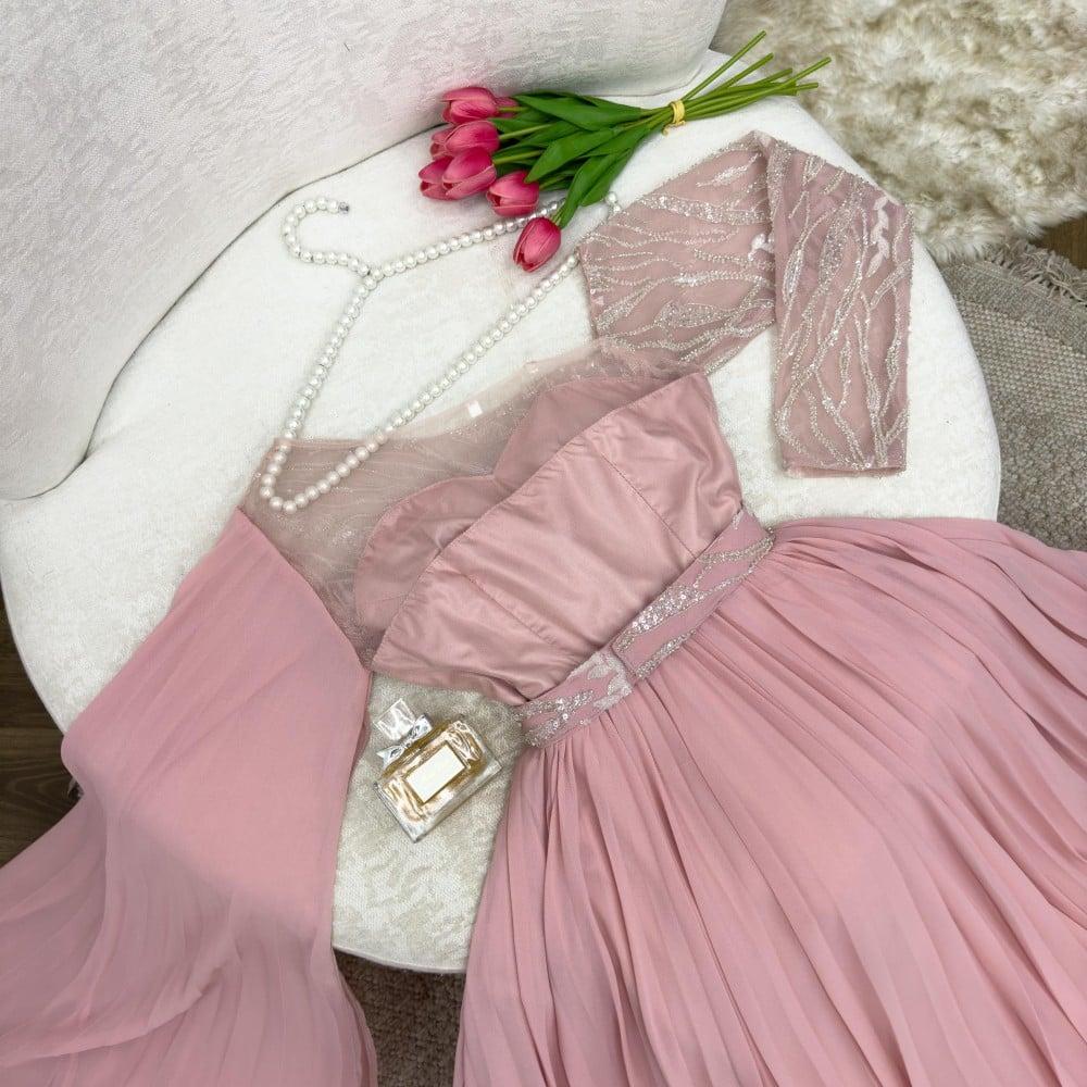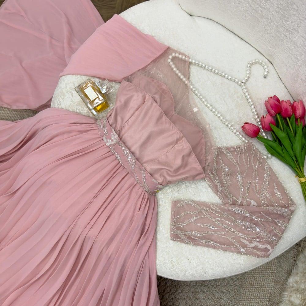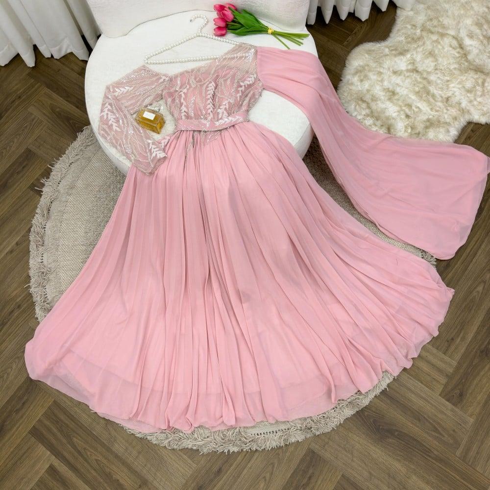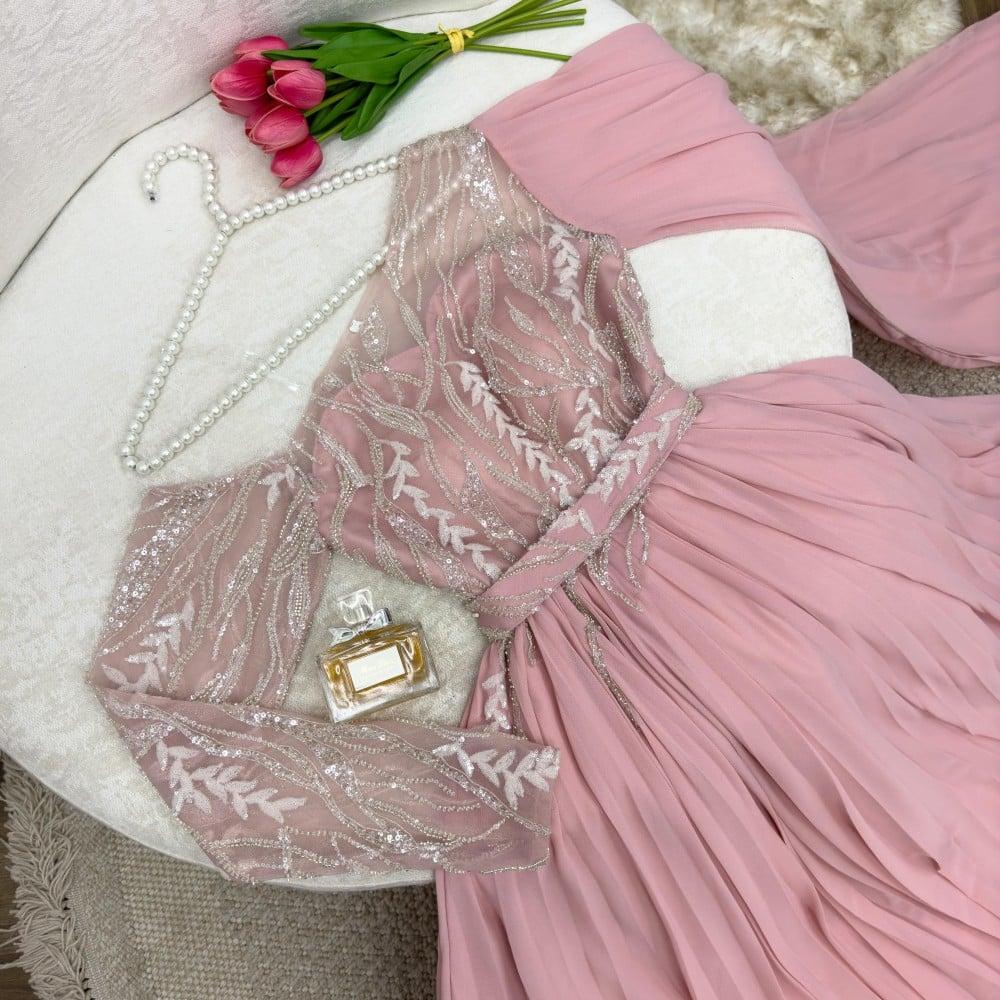 - 💠 الخامة: بلوزة شيفون مطرز يدوي × تنورة جورجيت ناعم