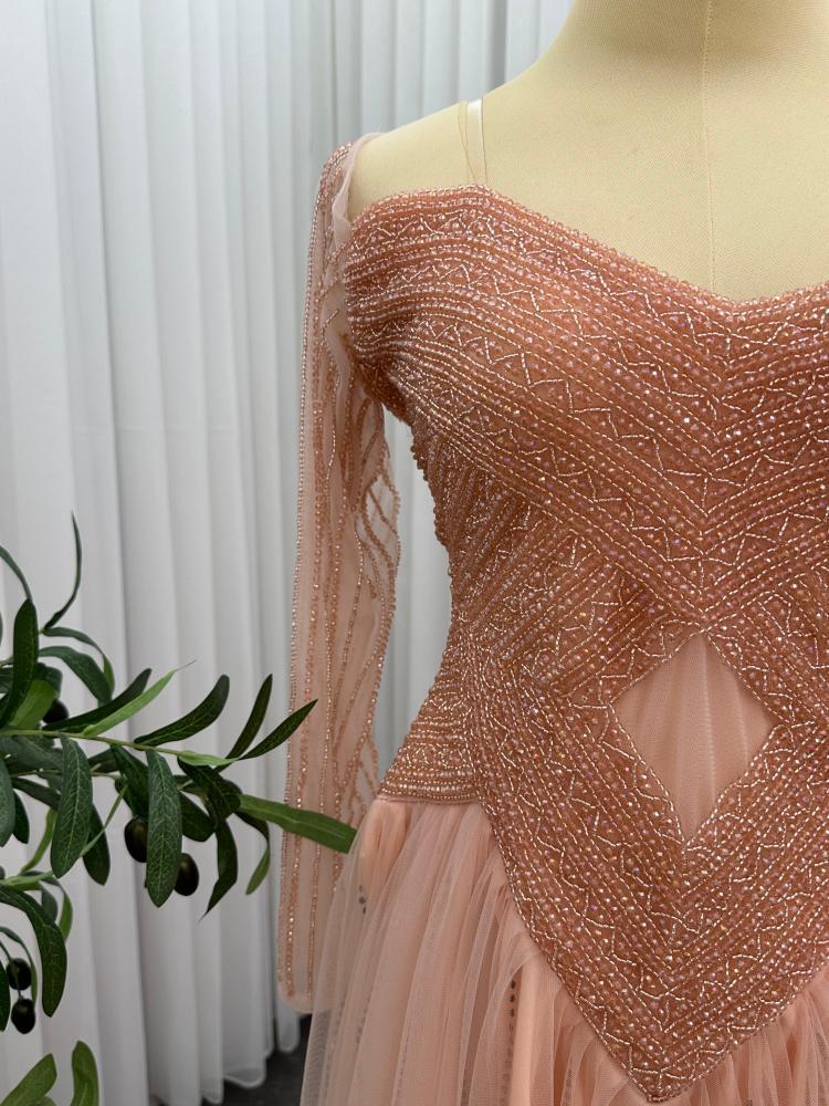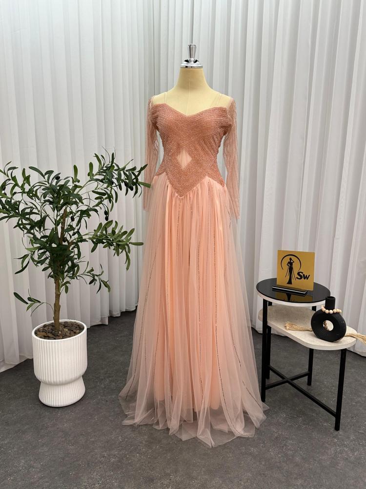 تألقي بأجمل إطلالة في مناسباتك مع هذا الفستان الساحر بلونه الخربزي الأنثوي وتصميمه الراقي.